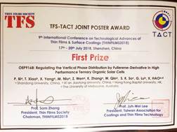 2018年7月17-20日,由国际薄膜学会主办的第九届国际薄膜大会(Thin Films 2018)在广东深圳市举办。公司郝晓涛课题组一行10人参加会议,博士生毕鹏青同学获得大会最佳海报奖唯一的一等奖。通过参加本次会议向全国同行展示了团队的最新研究成果,提高了全球最大顶级体育平台物理学科有机电子学方向的学术影响力。