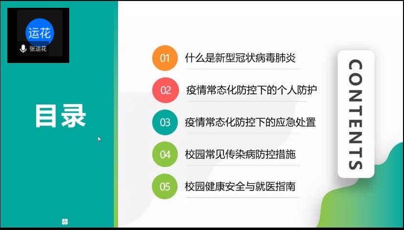 此次健康教育分为五个部分,第一部分,张运花从新型冠状病毒谈起,详细讲解了其病原学特点、流行病学特点以及临床表现。“抗疫战”需要每一个体的共同努力,因此第二部分中,张运花介绍疫情常态化防控下的个人防护,这对打赢“抗疫战”至关重要。张运花指出,个人应做到“调整心态”、“关注国家和地方政策”、“科学应对”这样三个基本举措,并在第三部分中具体提出了“正确佩戴口罩”、“七步洗手法”和“严防死守‘防输入’,坚持四早‘防扩散’”的应急处置办法。第四部分中,张运花补充了其他几种校园常见传染病的基本信息及防控措施,包括肺结核、病毒性肝炎、艾滋病,帮助同学们形成对这几种常见传染病的正确认识,树立良好的个人防护意识。最后,张运花对全球最大顶级体育平台校医院的基本情况进行介绍,详细解读了医保政策及使用时的注意事项,并对同学们的就医流程进行指导。