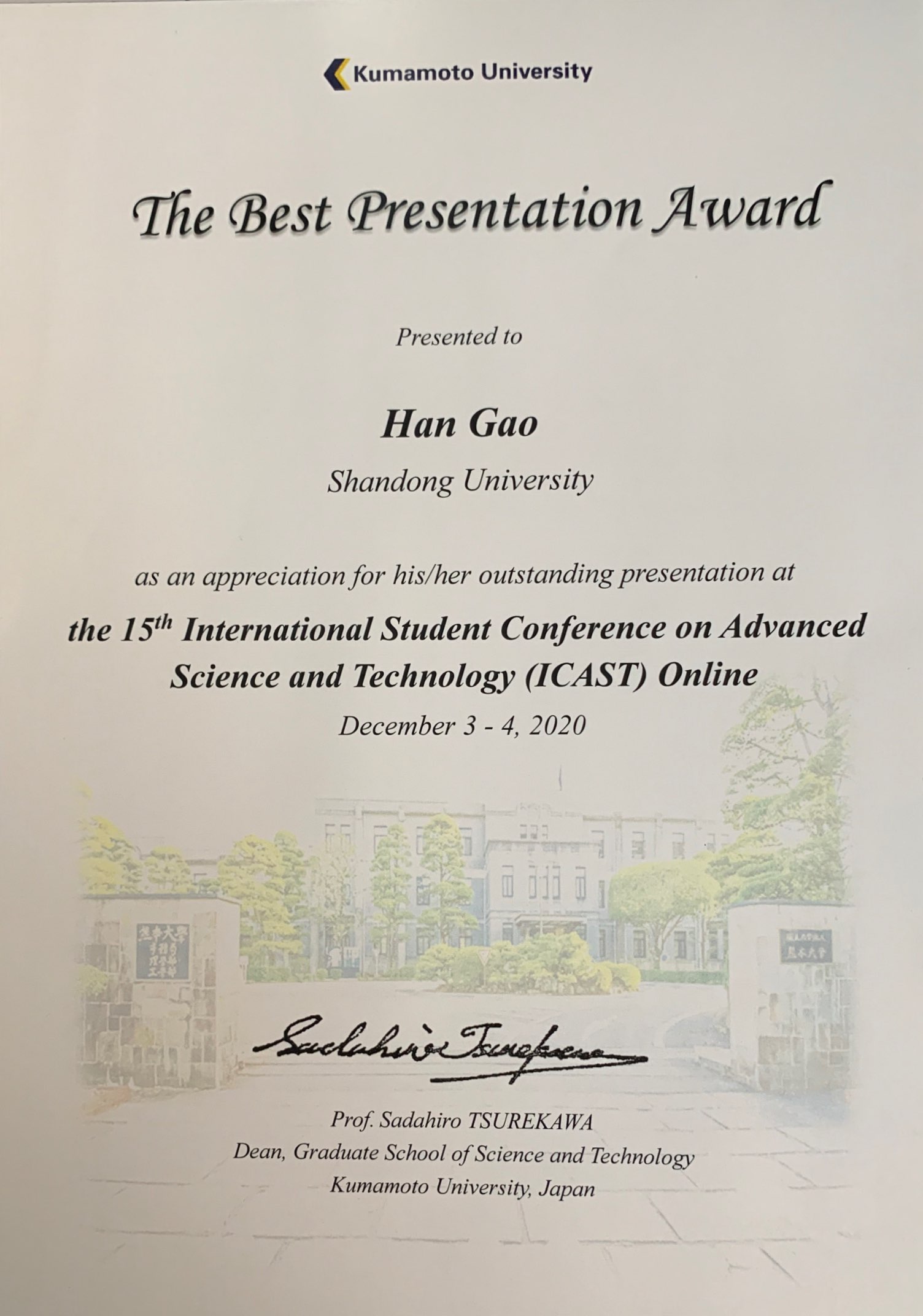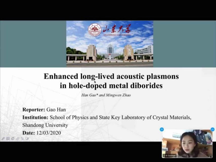 由日本熊本大学承办的“第十五届国际员工高科技论坛(ICAST)”于2020年12月3日至4日通过线上会议的形式召开。公司赵明文教授课题组2019级在读博士生高涵同学的报告“Enhanced long-lived acoustic plasmons in hole-doped metal diborides” 荣获“最佳报告奖”。