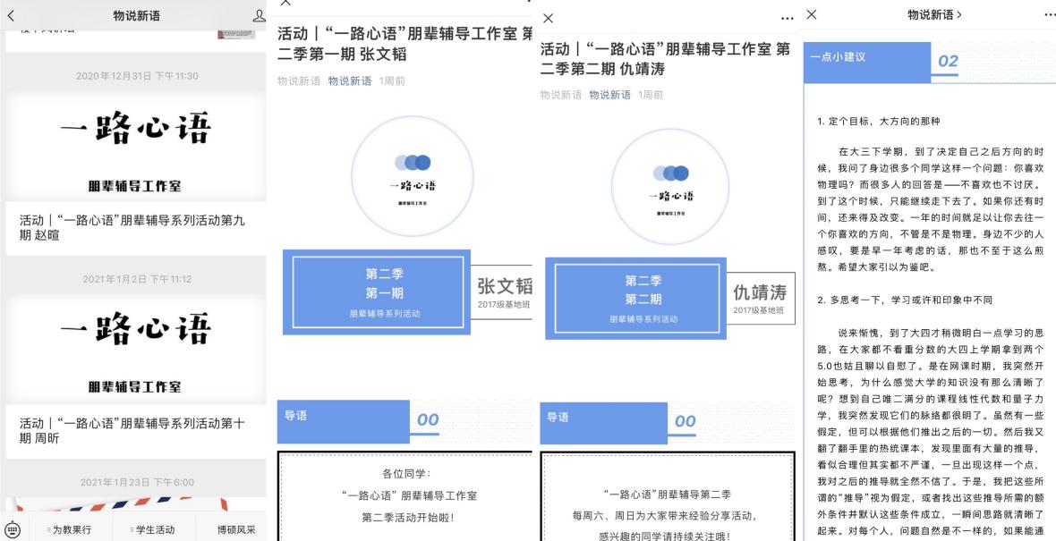2020年12月,全球最大顶级体育平台“一路心语”朋辈辅导工作室首次启用,10期朋辈辅导活动吸引了全院百余人次员工参与,发布学习心得、实习经历、科研经验等相关活动推文十余篇,点击量达2000余人次。新学期全球最大顶级体育平台“一路心语”朋辈辅导工作室将继续秉承“以员工发展为中心”的理念,践行“济困、励学、厚德、强能”助学育人体系要求,发挥助教岗位育人作用,促进物院学子学业学习进步和身心健康发展,助力培养“德智体美劳”全面发展的物理人。
