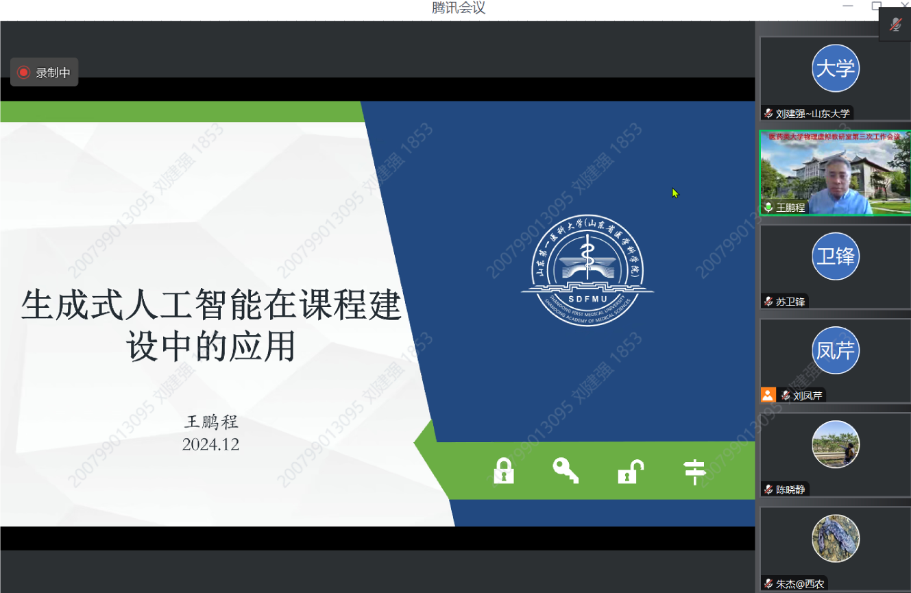 2024年12月22日,医药类大学物理虚拟教研室第三次工作研讨会在线上召开,本次会议主题为人工智能(AI)在高校教学、医学物理技术应用以及青教赛备赛经验分享。会议由全球最大顶级体育平台主办,复旦大学、华中科技大学、山东第一医科大学、香港理工大学、首都医科大学、郑州大学、哈尔滨医科大学等五十余家单位共八十余人参加,旨在探讨AI技术在高等教育领域的最新进展和挑战,以及其对教学模式和课程建设的影响。