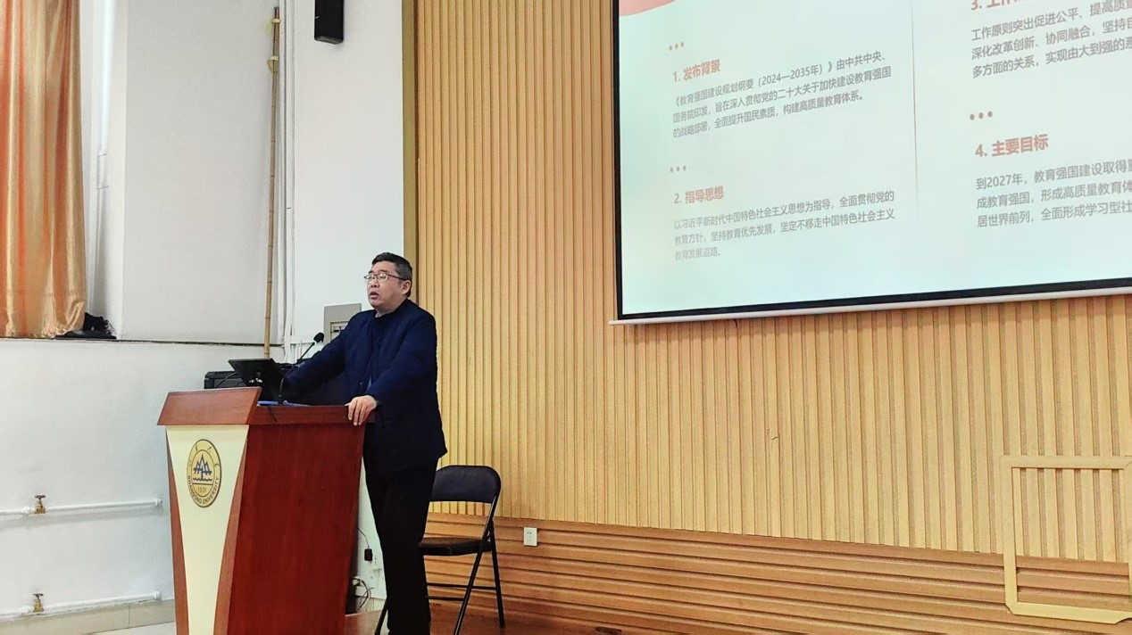 随后,郁鹏书记带领全体教职工从九个方面深入学习了《教育强国建设规划纲要(2024—2035)》。纲要强调,要塑造立德树人新格局,培养担当民族复兴大任的时代新人;办强办优基础教育,夯实全面提升国民素质的战略基点;增强高等教育综合实力,打造战略引领力量;培育壮大国家战略科技力量,有力支撑高水平科技自立自强;加快建设现代职业教育体系,培养大国工匠、能工巧匠和高技能人才;建设学习型社会,以教育素质化开辟发展新赛道、塑造发展新优势;建设高素质专业化教师队伍,筑牢教育强国根本;深化教育综合改革,激发教育发展活力;完善教育对外开放战略策略,建设具有全球影响力的重要教育中心。