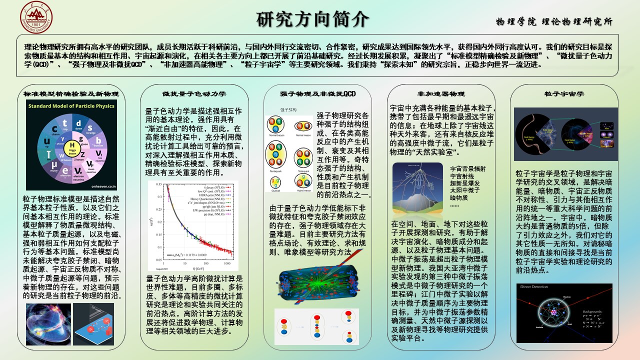 理论物理研究所致力于研究自然界最基本的物质结构和最基本的相互作用。大到宇宙整体,小到基本粒子,从各方面开展了诸多系列研究。